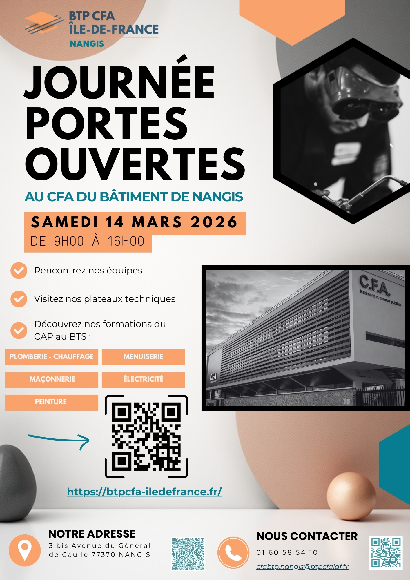 Le samedi 14 mars 2026, de 9h à 16h, le BTP CFA de Nangis organise sa Journée Portes Ouvertes.