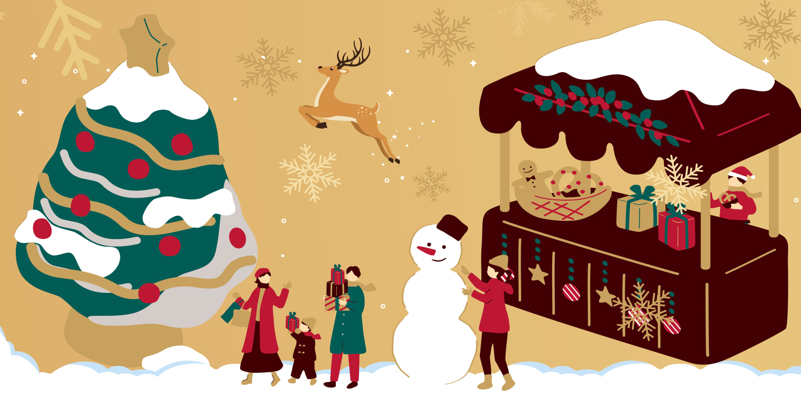 Vous serez plongés au cœur de la féérie dans un marché de Noël entièrement décoré et illuminé !